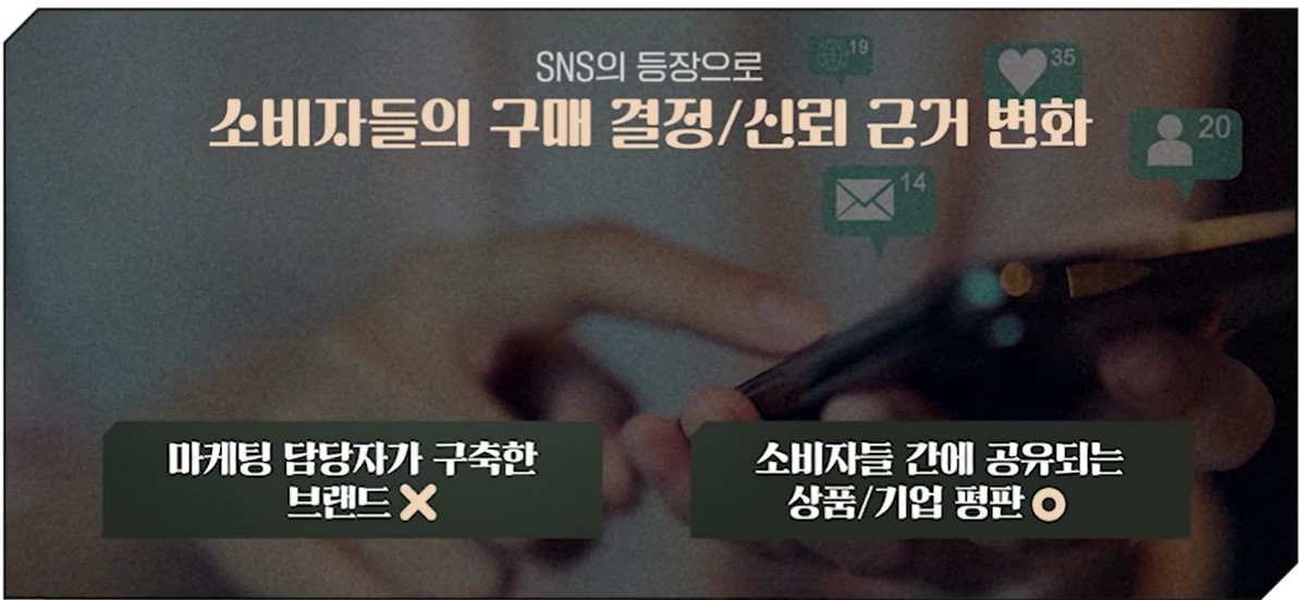 현재에는 소비자들이 기업과 제품에 대한 평판을 가장 신뢰하는 것으로 나타났습니다. 가족, 친지, 지인으로부터 전해지는 상품에 대한 경험과 평가, 그리고 온라인상에서 고객의 상품평이 영향력을 행사하고 있습니다. 기업은 플랫폼을 통해 고객들과 상호작용하고, 재미있고 공감할 수 있는 이야기를 통해 브랜드를 구축하고자 합니다.