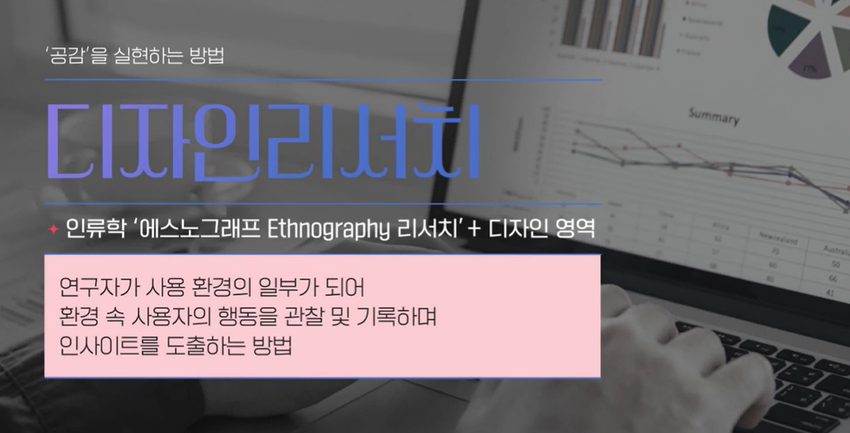 과거 기업들은 혁신성, 진출성, 비용 감수성, 자율성, 경쟁적 공격성이 중요하다고 여겼습니다. 그러나 최근 성공한 스타트업 대표들의 인터뷰를 분석해 보면, 공통적으로 중요하다고 새롭게 등장한 단어는 바로 "공감" 입니다. 공감은 누군가와 같은 입장이 되어서 공감한다는 것이 동정과는 매우 다릅니다. 적극적으로 고객의 입장이 되어 문제를 파악하고 그 해결책을 찾는 것이 공감의 핵심입니다. 이러한 공감은 디자인 리서치라는 방법을 통해서 실현할 수 있습니다. 디자인 리서치는 인류학의 한 분야인 민족지학, 즉 에스노그라피 리서치를 디자인 영역으로 도입한 것으로, 사용자의 환경에 직접 들어가서 행동을 관찰하고 인사이트를 발굴하는 방법론을 의미합니다.
