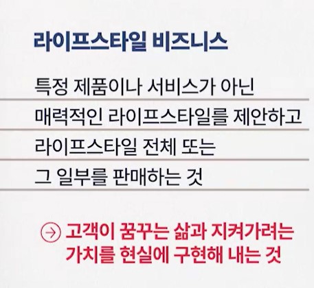 고객이 자신의 라이프 스타일에 맞는 제품과 서비스를 찾기 위해 드려야 할 노력을 대신해 주는 것이지요. 이런 큐레이션 서비스가 바로 라이프스타일 비즈니스입니다. 이 제품은 이래서 좋습니다. 이 서비스는 정말 쌉니다라고 고객을 유혹하지 않고 이렇게 살아보는 건 어떻습니까?라고 제안하고 고객이 이렇게 살고 싶다 또는 그래 이게 바로 내가 꿈꾸던 삶이야 라고 동의하는 지점에서 라이프 스타일 비즈니스는 성립합니다.