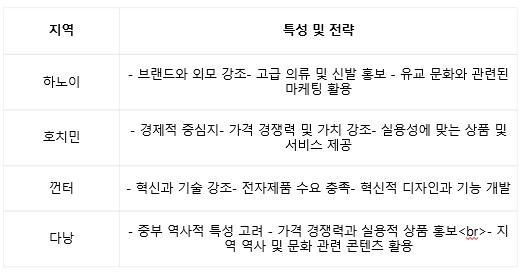 - 하노이: 브랜드와 외모에 대한 중요성을 강조하여 고급 의류와 신발 등 라이프 스타일 상품을 홍보하는 전략이 필요합니다. 또한 유교 문화와 관련된 마케팅 전략을 활용할 수 있습니다.