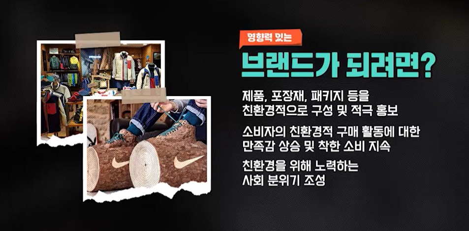 영향력 있는 리딩 브랜드는 제품과 포장재, 패키지 등을 친환경 소재로 제작하거나, 분리수거가 용이한 형태로 바꾸는 노력을 해야 합니다. 또한 이를 적극적으로 알림으로써 소비자의 구매 활동이 조금이라도 친환경적임을 알게 하고, 그로 인한 만족감은 또 다른 착한 소비로 연결되는 선순환 구조를 확산하여, 친환경을 위해 노력하는 사회적 분위기를 조성하는 역할을 해야 합니다.