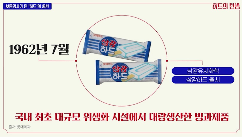 1962년에 식품위생법이 공표되면서 소규모 아이스케키 생산업자들은 문을 닫게 되었습니다. 하지만 이와 동시에 롯데푸드의 전신인 삼강유지화학은 삼강하드를 출시했습니다. 이로써 대량 생산된 국내 최초의 빙과 제품이 등장하게 되었습니다. 삼강하드는 스틱형 제품을 대표하는 브랜드로 인기를 얻었으며, 아이스크림 시장을 평정하는 데에 성공했습니다.