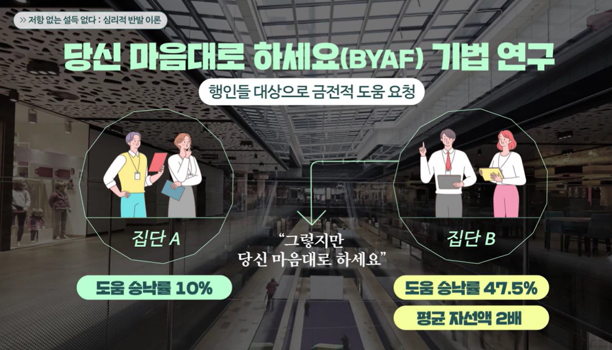 설득은 갑과 을 사이의 갈등으로 볼 수 있습니다. 미국의 심리학자 잭 브렘은 설득 메시지가 상대방의 자유를 위협한다고 설명합니다. 이로 인해 심리적 반발이 발생하며 설득의 성패가 좌우됩니다. 이러한 반발을 이용한 설득 기법 중에서 청개구리 기법과 당신 마음대로 하세요 기법, 거절하시겠지만 기법에 대해 설명하겠습니다.