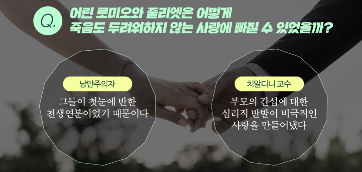 심리학자 시알테니 교수는 로미오와 줄리엣의 사랑을 심리적 반발이라는 감정 차원에서 해석했습니다. 청소년들이 어떻게 죽음도 두려워하지 않는 사랑에 빠질 수 있을까요? 낭만주의자들은 그들이 천생연분이었기 때문이라고 말합니다. 하지만 체리니 교수는 부모의 간섭과 심리적 반발이 비극적인 사랑을 만들어냈다고 주장합니다.