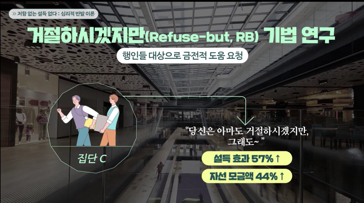 이 기법은 오히려 상대방의 거절 선택을 제한하여 심리적 반발을 유발하는 기법입니다. 선택의 자유를 제한함으로써 설득의 효과를 창출합니다.