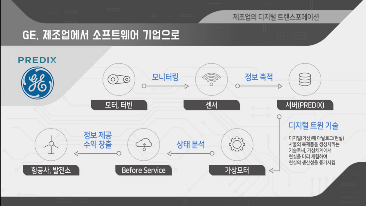 GE의 Predix 플랫폼은 산업용 인터넷을 위한 클라우드 기반 PaaS(Platform as a Service)로, 기계와 장비로부터 얻은 데이터를 분석하고 최적화하여 운영 효율성을 증대시키는 것을 목표로 합니다. Predix 플랫폼은 GE 내부적으로는 물론, 다양한 산업 분야의 고객들에게도 적용되어 제조 공정의 혁신을 가능하게 하고 있습니다.