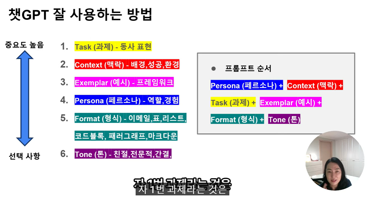 과제는 프롬프트에서 가장 중요한 부분입니다. 여기서는 동사로 명령을 내려야 합니다. 이렇게 동사로 표현하면 Chat GPT는 해당 작업을 수행해야 한다는 것을 쉽게 인식합니다. 이 명령을 가지고 챗GPT가 이 태스크가 나한테 있구나라고 인식하는 거예요.