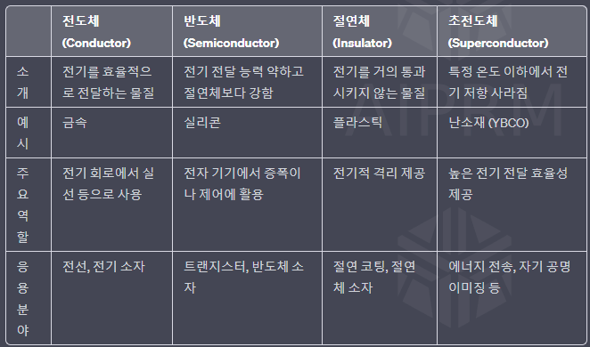 아래는 전도체, 반도체, 절연체, 초전도체에 대한 정보를 표로 구분하여 정리한 표입니다.