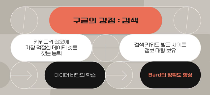 구글이 제일 잘하는게 검색, 다시 말하면 수많은 인터넷의 데이터 중에서 키워드나 질문을 입력했을 때 거기에 가장 적절한 데이터셋을 찾는 능력 그리고 수많은 사람들이 그 검색 키워드로 방문했던 사이트에 관한 정보 이것를 구글은 다 갖고 있기 때문에 그 데이터를 바탕으로 학습을 시키는 방식으로 진행한다면 구글이 만든 바드가 훨씬 더 정확하게 답을 낼 가능성이 장기적으로 보면 있습니다.