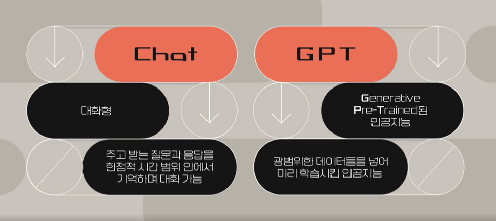챗(Chat)이라고 하는 것은 대화형이라는 뜻입니다. 그리고 내가 물어보면 답해주고 또 물어보면 답해주면서 바로 전까지 했던 질문들에 대한 기억들은 가지고 있는 그렇지만 길게 기억하고 있지는 못하는 형태의 인공지능이고요.